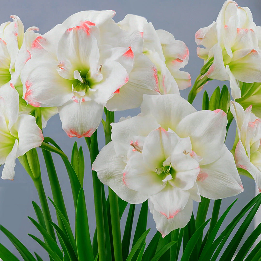 Variedad AMADEUS: es una de las variedades más elegantes y llamativas dentro de los Hippeastrum (amaryllis). Es muy apreciado por su flor doble, grande y extremadamente decorativa. De color blanco cremoso con vetas o pinceladas rosadas hacia los bordes. De muy buen tamaño, es grande, al florecer casi como una peonía o una rosa abierta. Sus pétalos son amplios, ligeramente ondulados y parecen superpuestos. Cada flor puede medir 18–22 cm de diámetro según el tamaño del bulbo.